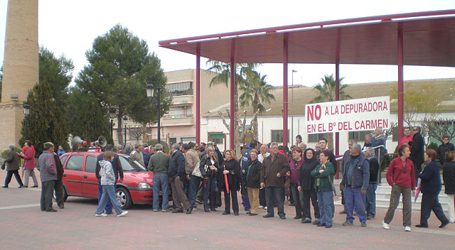 Alrededor de 250 personas, residentes del Barrio del Carmen, acudieron a la concentración del pasado sábado 31 de enero para mostrar su oposición a los planes del Ayuntamiento y de la Consejería de Agricultura y Agua en cuanto a la ubicación de la nueva estación depuradora (EDAR) en la zona de Los Quiñones, en el Barrio del Carmen de Alguazas.
