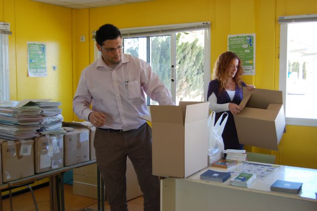 El alcalde de Alguazas, José Antonio Fernández Lladó, acompañado por el concejal de Medio Ambiente, Javier Gambín, la concejala de Educación, Isabel Zamora, y el concejal de Agricultura, Fernando Almagro, acudieron al Ecoparque con motivo de la retirada de los libros recogidos a través de la campaña "Palabras solidarias".
