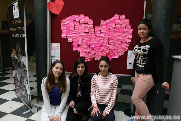 ¡Qué mejor que ambientar el día de San Valentín con mensajes de amor¡. Esto fue lo que hicieron este pasado Jueves, 14 de Febrero, los estudiantes de Secundaria de Alguazas dando de esta forma rienda suelta a sus sentimientos, cálidas emociones que plasmarían en dedicatorias amorosas escritas de su puño y letra y seguidamente colocadas bien en un mural rojo con la añadida entrega de dulzura simbólica a modo de caramelos –si hablamos de los alumnos del IES "Villa de Alguazas"- bien un tablón donde los mensajes románticos trazados para la ocasión en "posit" formaban un corazón gigante –algo que llevarían a buen puerto los jóvenes del CES "Vega Media"-.