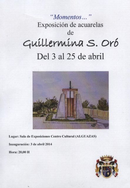 "Momentos" de Guillermina Sánchez Oró, promovida por la Concejalía de Cultura del Ayuntamiento de Alguazas en el marco de los eventos conmemorativos en la localidad del Día Mundial del Libro 2014, será inaugurada a las 20 horas de este próximo 3 de abril, jueves. Estamos ante una muestra que es en sí misma un poso de rica policromía, una esencia de claro significado murciano, la que destilan unas obras expuestas para conseguir conquistar los corazones de los visitantes que acudan a descubrir la vena creativa de una artista autodidacta enteramente consagrada a imprimir en su producción su carácter autentico.