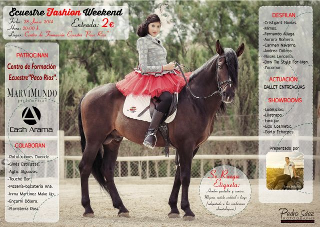 Alguazas montará a lo grande un evento novedoso donde la moda, la gastronomía, el baile, la música, los showrooms, la exhibición de espectáculos hípicos, los concursos y sorteos de regalos conformarán una buena combinación de amenidad y disfrute que responde al nombre de "Ecuestre Fashion Weekend". Contando para su organización con la labor activa y desinteresada labor de los comunicadores alguaceños Andrea Dólera y Joma Peñalver y con la colaboración de la Concejalía de Festejos del Ayuntamiento local y la Asociación de Mujeres también del municipio, esta cita con el diseño al máximo nivel reunirá a partir de las 20 horas de este sábado, 28 de junio, a lo más granado de los creadores murcianos. Será en el Centro de Formación Ecuestre "Paco Ríos", sito en la Finca "El Salitre" de Alguazas.