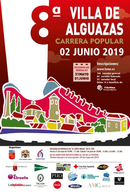 El coste de las mismas es de 10€ para la carrera absoluta (8€ atletas con licencia FAMU en vigor), siendo de 5€ para los corredores locales y de 1€ solidario desde la categoría pre-benjamín hasta juvenil, que irá destinado a Cáritas Alguazas. No se realizarán inscripciones fuera de plazo ni el día de la prueba. Los dorsales podrán recogerse en El Corte Inglés del Centro Comercial “Myrtea”, el viernes 31 de mayo de 18:00 a 21:00h., y el sábado 1 de junio de 10:30 a 13:30h. y de 17:00 a 20:00h. Se recuerda la obligación de mostrar el DNI o documento acreditativo de identidad para su recogida.