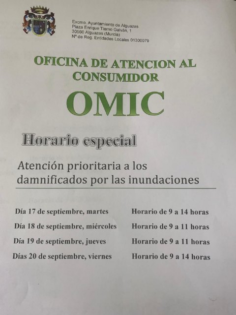 Tras el temporal de lluvias, el Ayuntamiento de Alguazas ha decidido reforzar el servicio de la Oficina Municipal de Información al Consumidor (OMIC) durante esta semana para atender a los afectados por el temporal de lluvias.