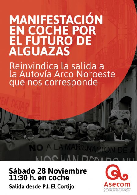 La Asociación de Empresarios y Comerciantes del Segura (ASECOM) sigue con sus medidas para reivindicar el cambio de ubicación de la salida a Alguazas del futuro Arco del Noroeste, un proyecto que debe conectar la A-30 con la A-7. Por ello, mañana sábado 28 de noviembre (11'30 horas) ha convocado una manifestación en coche por el municipio, que partirá del Polígono Industrial El Cortijo. "El proyecto actual condenará a Alguazas al aislamiento, no podemos permitirlo porque se condenará su futuro económico, industrial y demográfico", recalca el presidente de ASECOM, Eloy Jiménez.