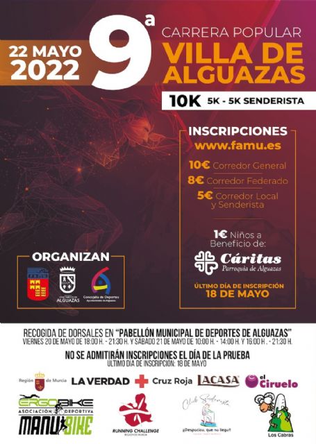 La Concejalía de Deportes del Ayuntamiento de Alguazas, en colaboración con la Federación de Atletismo de la Región de Murcia, organiza la 9ª Carrera Popular "Villa de Alguazas", desde las 9:30h.